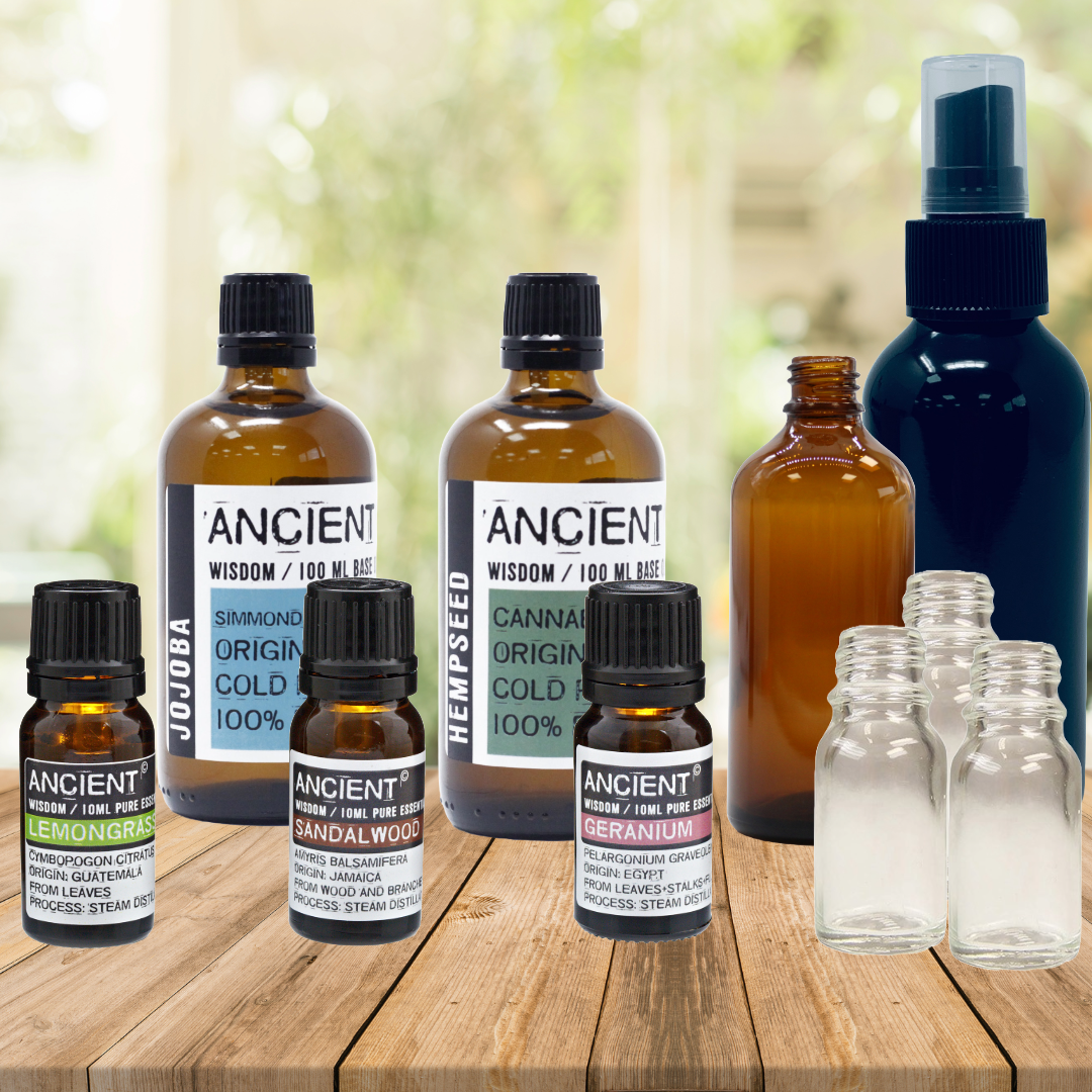 For 120ml Black Aluminium Spray Bottle: 30ml of each carrier oil, 5 drops of each essential oil and 30ml water. Shake before use each time and store out of direct sunlight.