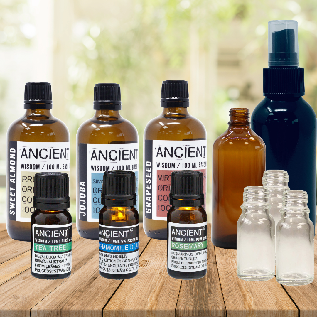 For 120ml Black Aluminium Spray Bottle: 30ml of each carrier oil, 5 drops of each essential oil and 30ml water. Shake before use each time and store out of direct sunlight.