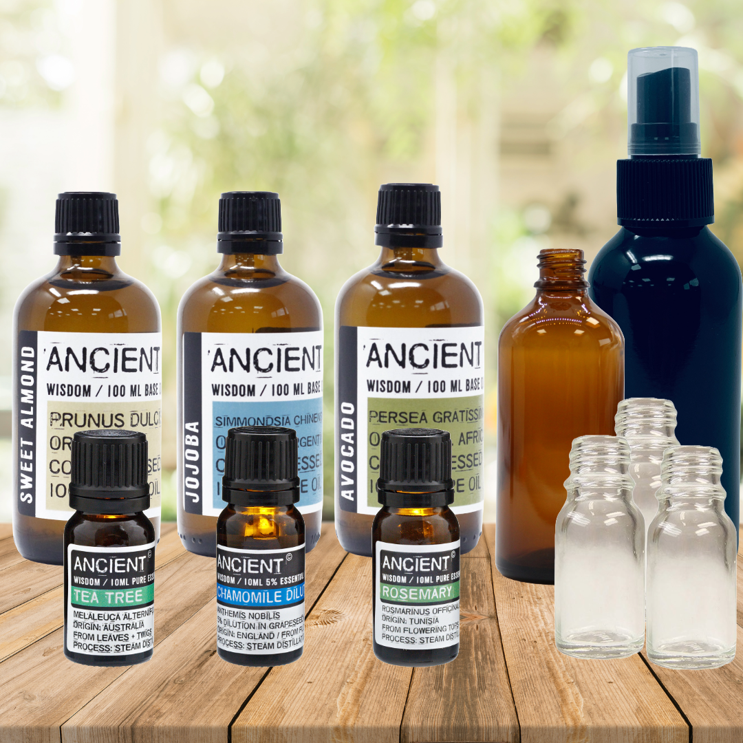 For 120ml Black Aluminium Spray Bottle: 30ml of each carrier oil, 5 drops of each essential oil and 30ml water. Shake before use each time and store out of direct sunlight.