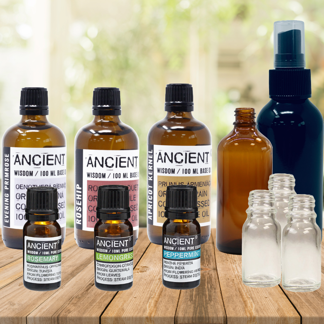 For 120ml Black Aluminium Spray Bottle: 30ml of each carrier oil, 5 drops of each essential oil and 30ml water. Shake before use each time and store out of direct sunlight.